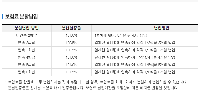 각 방식에 따라 할증율이 다르며, 자동이체로만 납부가 가능합니다. 모바일에서는 분납특약 선택이 불가능하므로, PC 홈페이지를 통해 신청해야 합니다. 이 제도는 고객의 경제적 부담을 줄이고, 보다 유연한 보험료 관리를 지원합니다.